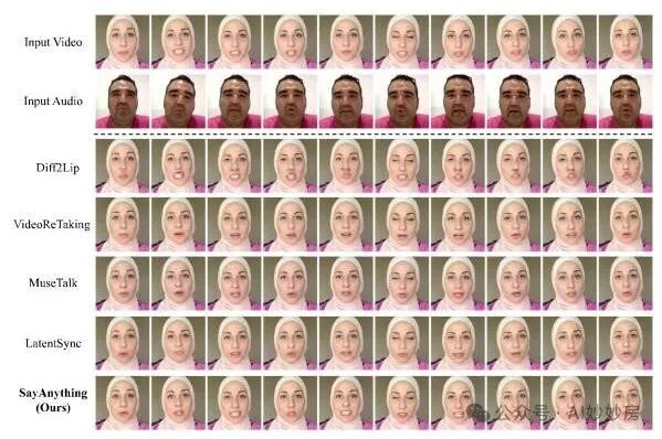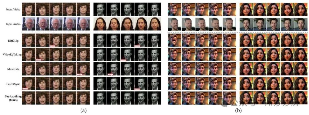 图4. 与最先进的基于扩散的唇形同步方法(穆克霍帕德亚伊等人,2024年;张等人,2024年;李等人,2024年;程等人,2022年)的定性比较。第一行展示的是原始输入视频,第二行是我们提取音频作为输入的视频,该视频可视为目标唇部动作。第3 - 7行展示的是唇形同步后的视频。(a) 跨性别和身份生成设置中的两个案例。(b) 动画设置中的两个案例。我们的方法可以生成更具表现力的视觉特征,就像驱动动画师一样,而其他方法则倾向于生成更逼真但虚假的特征。