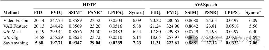 如表1所示,我们的方法在两个数据集的大多数指标上都表现出持续的改进。虽然我们的方法的Sync-c分数(钟和齐斯曼,2017年)较低,但该指标是由原始的SyncNet模型计算得出的。值得注意的是,所有四种基线方法在训练期间都将Sync-Net作为额外的监督信号,其中LatentSync采用了优化版本,其产生的分数超过了真实值。我们在视觉质量、身份保留、时间一致性和有竞争力的唇形同步方面的结果证明了SayAnything方法的优越性。