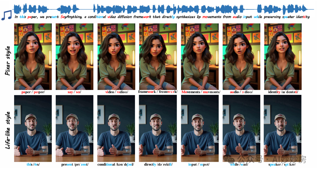 图7. SayAnything生成的皮克斯(Pixar)和虚拟角色视频的可视化展示。