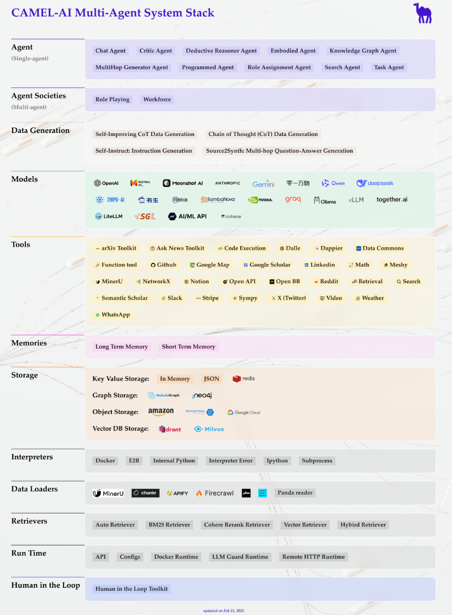 🐫 CAMEL 是一个致力于寻找代理扩展规律的开源社区。我们相信,大规模研究这些代理可以深入了解它们的行为、能力和潜在风险。为了促进该领域的研究,我们实现并支持各种类型的代理、任务、提示、模型和模拟环境。