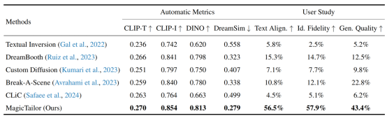 我们将 MagicTailor 与基于自动指标(CLIP-T、CLIP-I、DINO 和 DreamSim)和用户研究(人类对文本对齐、身份保真度和生成质量的偏好)的 SOTA 个性化方法进行比较。最佳结果以粗体标记。 MagicTailor 可以在这项具有挑战性的任务中取得卓越的性能。