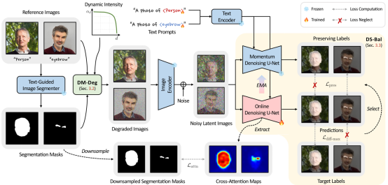 MagicTailor 使用参考图像作为输入,通过低秩自适应 (LoRA) 微调 T2I 扩散模型,以学习目标概念和组件,从而能够生成将组件无缝集成到概念中的图像。 我们引入了动态掩码退化(DM-Deg),这是一种动态干扰不需要的视觉语义的新技术。这种方法有助于抑制模型对不相关视觉细节的敏感性,同时保留整体视觉上下文,从而有效减轻语义污染。 此外,我们采用双流平衡(DS-Bal),一种旨在平衡视觉语义学习的双流学习范式,来解决语义不平衡的问题。在线去噪 U-Net 执行样本最小-最大优化,而动量去噪 U-Net 应用选择性保留正则化,确保更忠实的个性化。