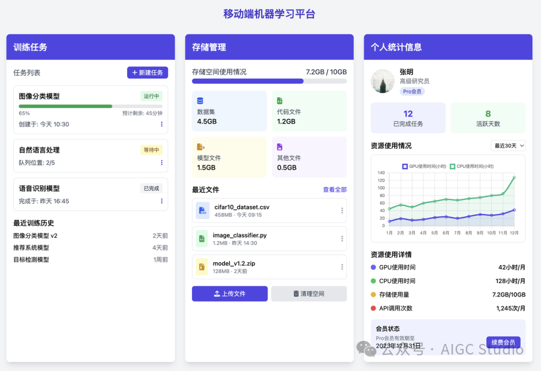 给我设计一个移动端机器学习平台的 UI,其中要包括训练任务,存储管理,和个人统计信息界面。个人信息统计界面要用图表展示用户过去一段时间的各类资源使用情况。使用 Tailwind CSS 来美化页面,把这 3 个手机界面平铺展示到一个 HTML 页面中。