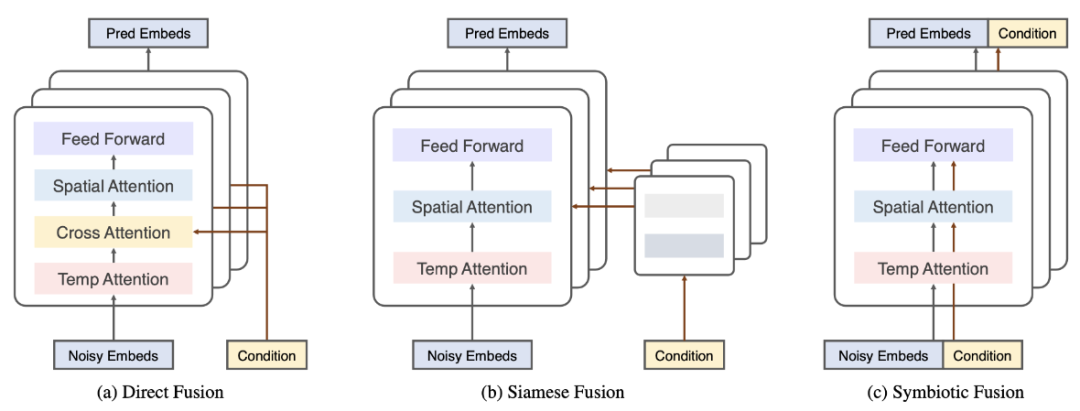 直接融合。将条件直接输入到每个块的交叉注意模块中; -