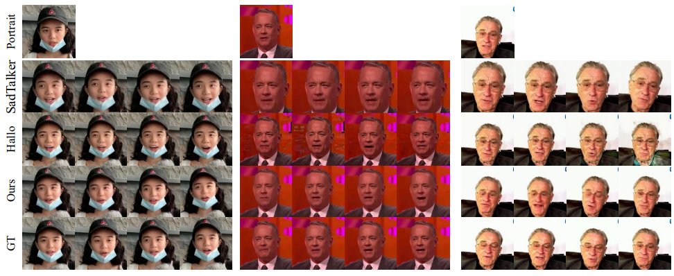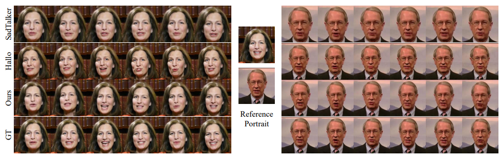 在HDTF数据集上与其他前沿方法的定性比较。论文的方法实现了更好的音频动画对齐(例如嘴唇运动),并产生了富有表现力的结果。