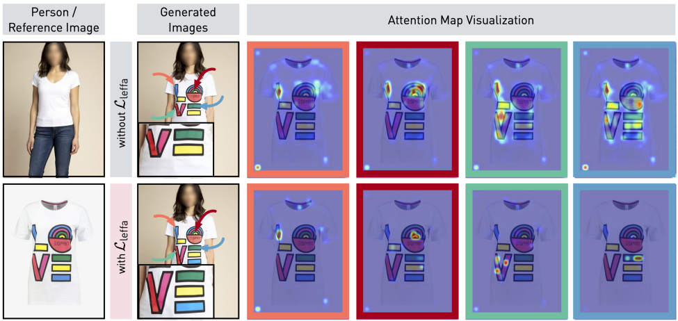 可视化特征图以评估Leffa损失 Lleffa 的影响。添加 Leffa 损失后,该方法不仅保持了整体生成质量,而且更准确地保留了细粒度细节。此外,注意力图可视化表明,在该损失下,目标查询更精确地关注正确的参考区域。