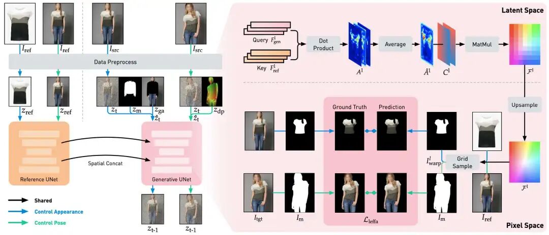用于可控人物图像生成的Leffa训练流程的概述。左侧是基于扩散的基线;右侧是Leffa损失。Isrc 和 Itgt 在训练期间是同一张图像。