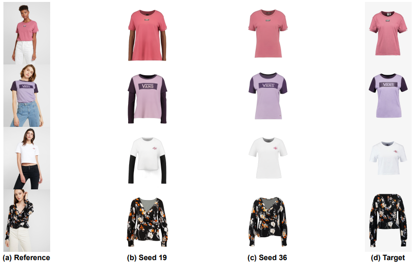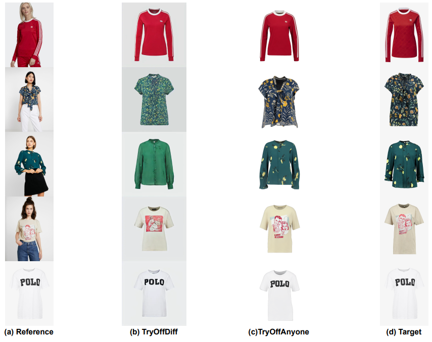 与依赖文本编码器如CLIP来调节生成过程的稳定扩散不同,我们提出的架构通过利用衣服掩码提供的空间信息消除了对文本描述的需求。这种基于衣服掩码的指导在两个关键方面显着改善了生成过程;它通过提供目标服装的明确定位来提高图像质量,减少文本提示引入的歧义,同时通过消除与文本编码器相关的计算开销来简化训练流程,从而提高训练效率。
