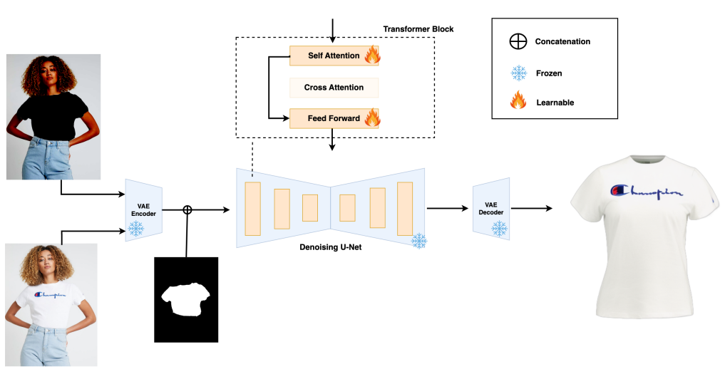 上图说明了所提出的网络架构,重点介绍了对去噪扩散 U-Net 中的变压器块的微调方法。为了确定最佳配置,论文尝试了各种训练参数设置,包括微调整个架构、变压器块以及变压器块内的注意层。经过大量实验,我们选择了变压器块微调作为最有效的方法,与仅注意和全架构训练相比,其性能显着提高。仅对注意层进行微调不足以完成生成虚拟试穿的复杂任务,因为它缺乏完全捕捉所需复杂结构和纹理细节的能力。