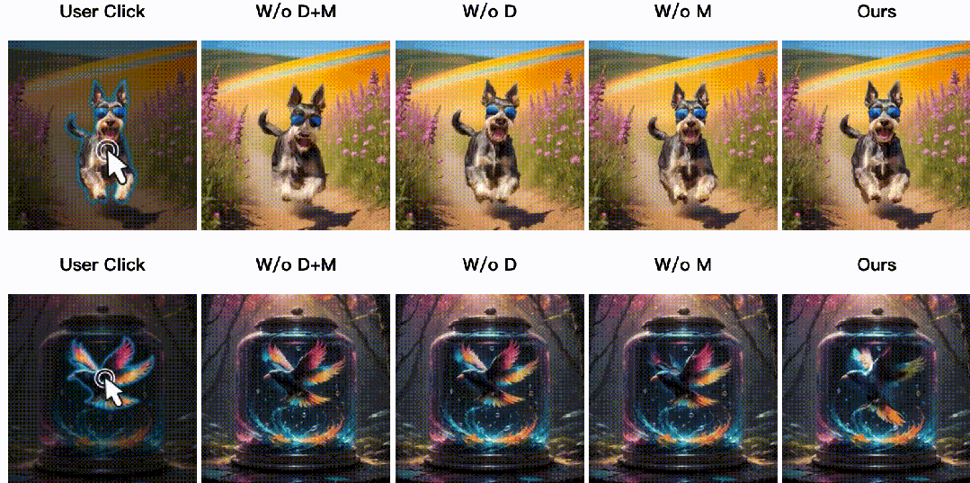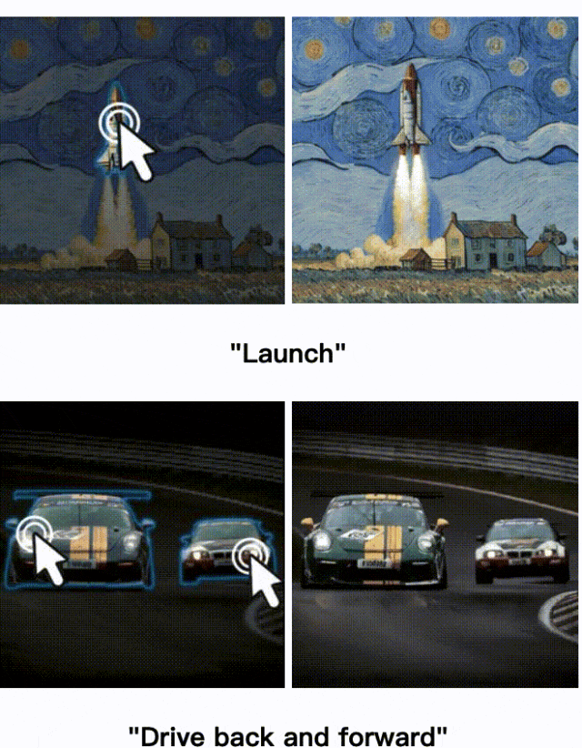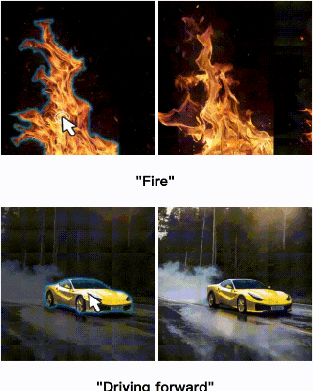 区域图像动画使用点击和简短提示。我们提出一种新的框架,通过用户提供的点击(移动到哪里)和简短的动作提示(如何移动),促进本地感知图像动画。我们的框架可以提供生动的对象运动,背景运动(例如,风暴),和多个对象移动。最好使用acrobatreader查看,它支持单击在视频上播放动画。