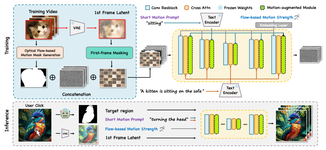 框架概述。我们的框架的关键组件是第一帧掩蔽,运动增强模块的短动作提示跟随,和基于流量的运动强度控制。在推理过程中,区域动画可以是通过用户点击和简短的动作提示实现。