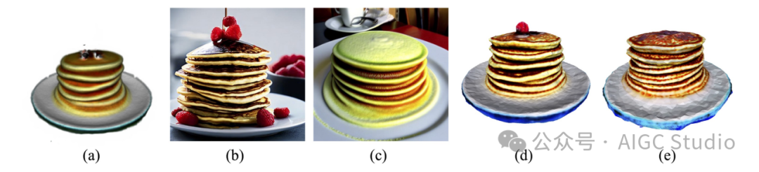 DCM细化示意图。(a) 与伪影解除纠缠的NeRF; (b)原始稳定扩散采样图像(SD), (c) DCM采样图像(SD), (d)由于对原始SD进行微调而产生的不良结果,以及(e) DCM SD固定的伪影。