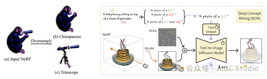 左图:扩散模型中的概念差异。文本提示是“一只黑猩猩正在通过望远镜观察”。右图:深度概念挖掘 (DCM) 概述。我们使用掩蔽扩散损失对文本嵌入和 T2I 扩散模型进行微调。