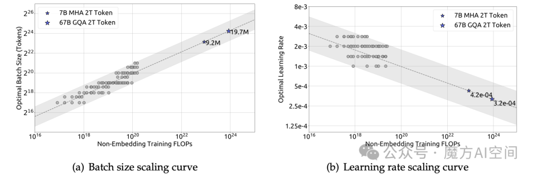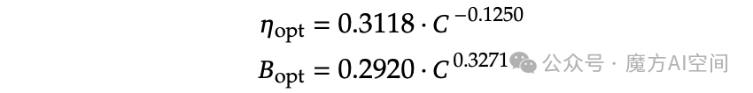缩放定律:通过实验建模了计算预算C与最佳批量大小和学习率之间的幂律关系,公式如下: