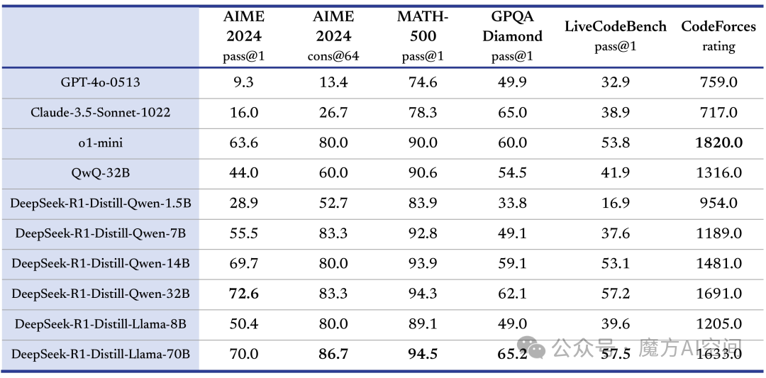 蒸馏小模型超越 OpenAI o1-mini:从DeepSeek-R1中蒸馏推理能力到更小的密集模型。使用Qwen2.5和Llama系列模型作为基础模型,通过简单的SFT蒸馏方法显著提升推理能力。