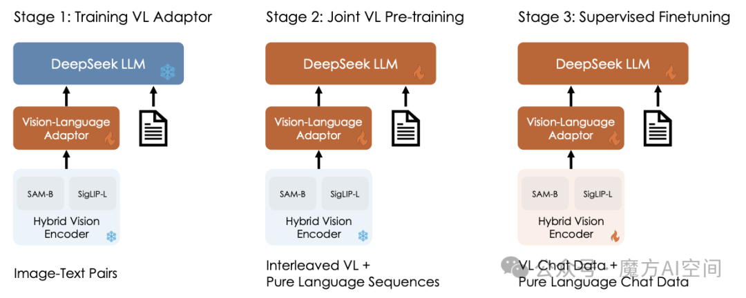 训练流程:训练分为三个阶段:视觉语言适配器预热、联合视觉语言预训练和监督微调。在第一阶段,仅训练视觉语言适配器;在第二阶段,联合优化语言模型和视觉适配器;在第三阶段,使用监督数据进行微调。