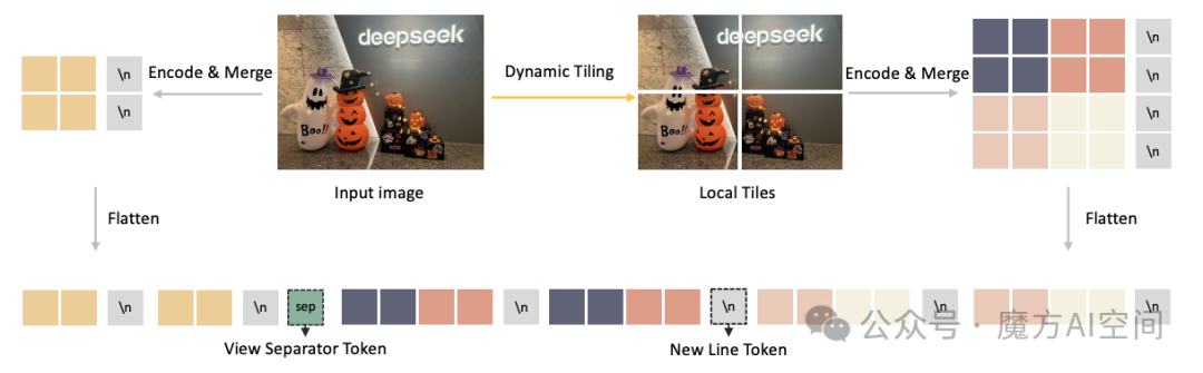 动态切片视觉编码策略:为了高效处理高分辨率图像的不同宽高比,DeepSeek-VL2采用了一种动态切片策略。该策略将高分辨率图像分割成多个局部切片,每个切片通过共享的视觉变换器进行处理,然后将提取的特征集成到语言模型中。这种方法避免了固定大小编码器的限制,提升了超高分辨率图像处理能力。