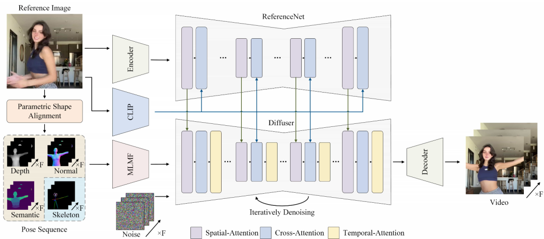 具体来说,结合了从SMPL序列获得的渲染深度图像、法线图和语义图,以及基于骨架的运动指导,以丰富具有全面 3D 形状和详细姿势属性的潜在扩散模型的条件。采用集成自注意力机制的多层运动融合模块来融合空间域中的形状和运动潜在表示。