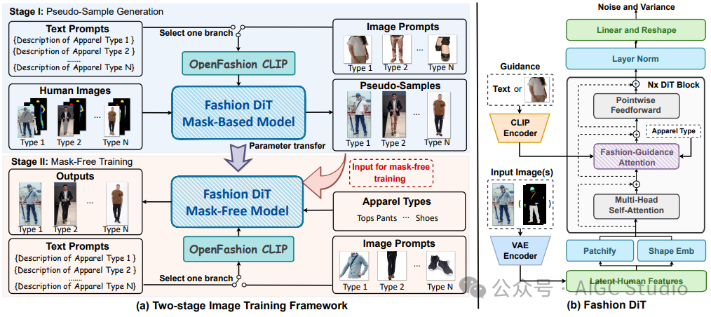时尚编辑框架的整体架构。(a)两阶段图像训练框架。在第一阶段,我们训练了一个基于掩码的模型,使用未配对的文本提示或图像提示来生成伪样本。在第二阶段,我们使用配对提示和服装类型作为输入,利用生成的伪样本训练最终的无口罩。这个阶段的训练目标是生成逼真的图像。(b)时尚资讯科技的架构。