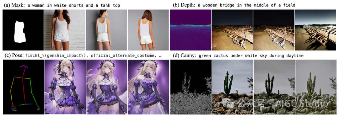 ControlNeXt还支持各种条件控件类型。选择“mask”,“depth”,“canny”和“pose” 如条件控件,分别从上到下显示。