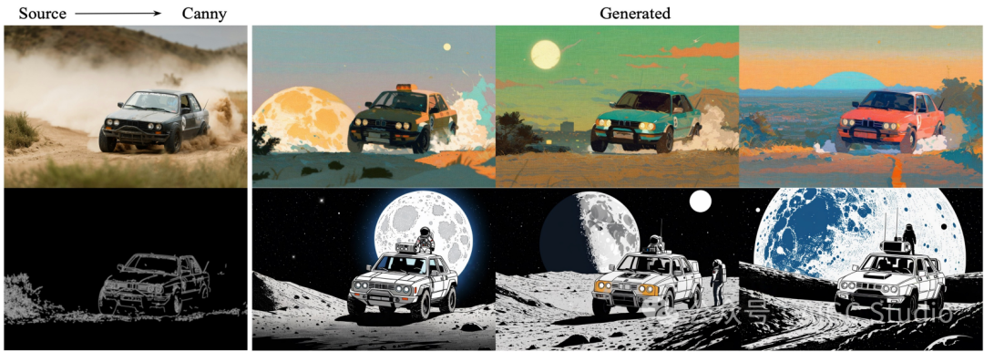 上图给出了SDXL的详细生成结果。我们从输入的自然图像中提取Canny边缘使用我们的SDXL模型实现样式转换。