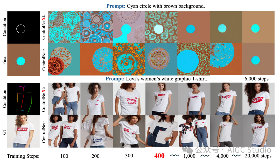 ControlNeXt实现了显著更快的训练收敛和数据拟合。它可以学习适应条件控制较少的训练步骤,也显著缓解了突然收敛问题。