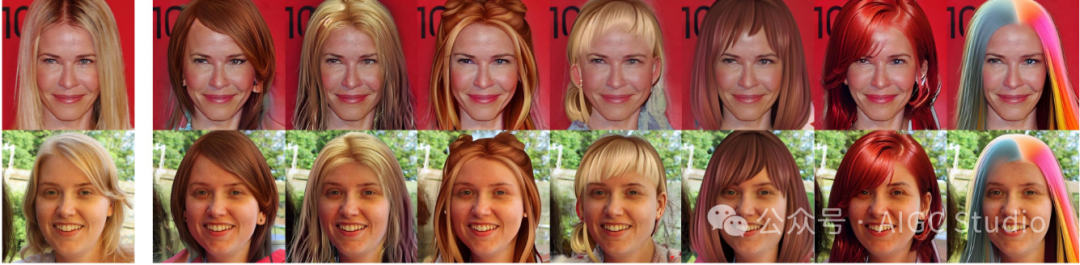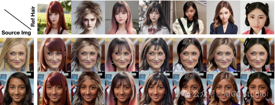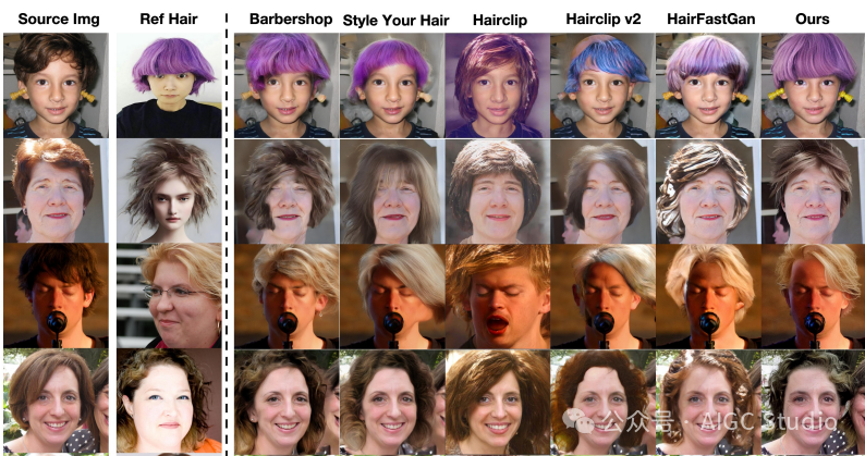 与其他方法相比,我们的方法实现了更精细和稳定的发型转换,而无需精确的面部对齐或明确的面具进行监督。