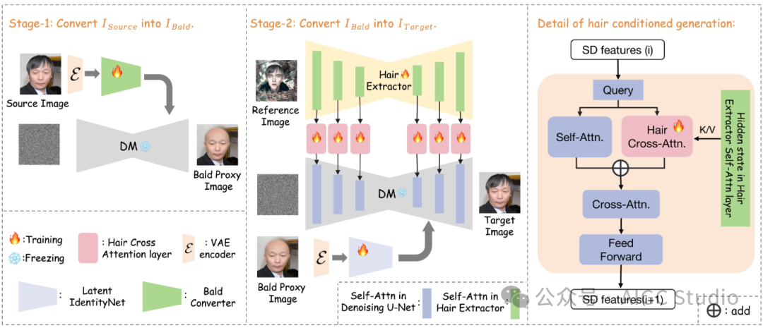 我们的 Stable-Hair 包含两个阶段,可实现高质量的头发转移。首先,将用户的输入源图像转换为秃头代理图像。此转换是使用预训练的稳定扩散 (SD) 模型与专门的秃头转换器结合完成的。在第二阶段,我们使用预训练的 SD 模型和头发提取器将参考头发转移到秃头代理图像上。头发提取器负责捕捉参考头发的复杂细节和特征。然后通过新添加的头发交叉注意层将这些特征注入 SD 模型。通过利用这两个阶段,我们的方法实现了高度详细和高保真的头发转移,产生自然且视觉上吸引人的效果。