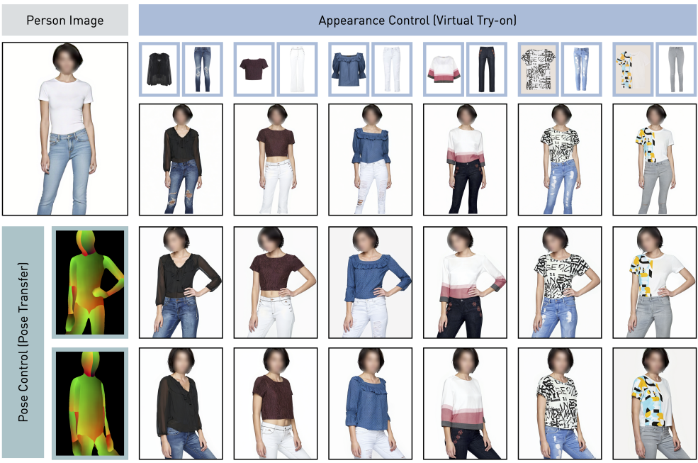 与其他方法的定性视觉结果比较。在虚拟试穿中,使用论文方法生成姿势转换的输入人物图像。可视化结果表明,该方法不仅可以生成高质量的图像,而且还大大减少了细粒度细节的失真。