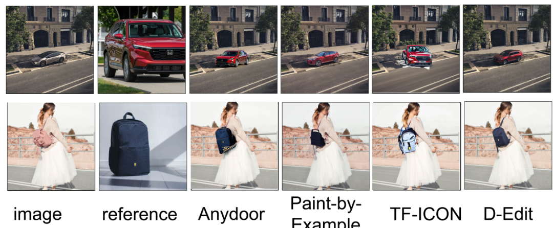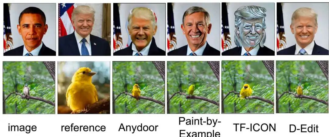 图像引导编辑的定性比较。在项目替换和面部交换方面,D-Edit 与 Anydoor、Paint-by-Example 和 TF-ICON 进行了比较。