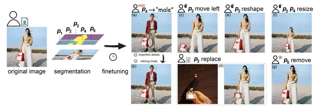 使用 D-Edit 的编辑流程。用户首先上传一张分割成多个项目的图像。微调 DPM 后,用户可以进行各种类型的控制,包括
