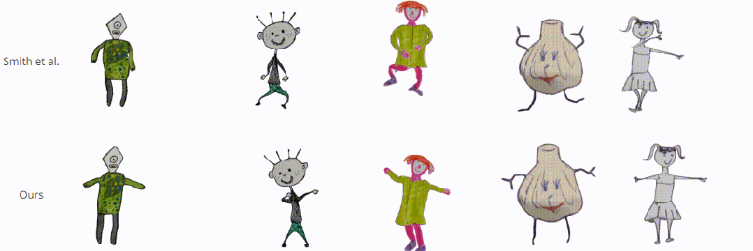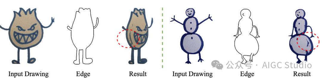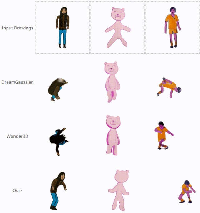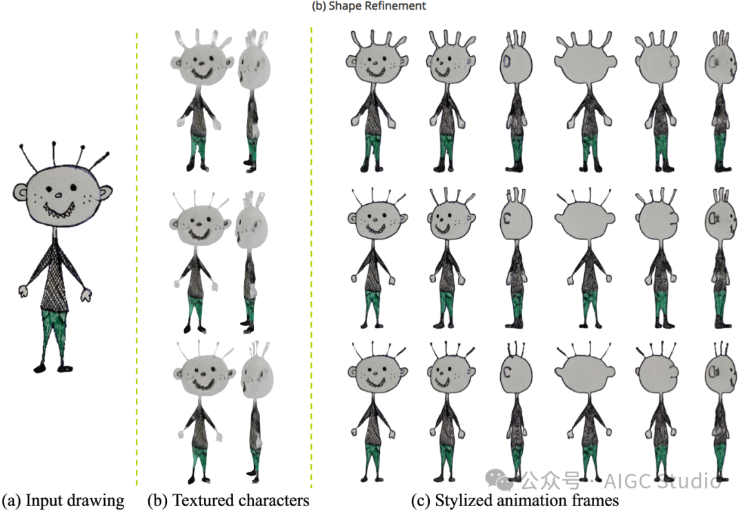 为各种人物画制作动画是一项引人入胜的视觉内容创作任务。给定一个人物画,现有的动画方法仅限于平面 2D 运动,因此缺乏 3D 效果。另一种解决方案是从人物画中重建 3D 模型作为代理,然后将 3D 运动数据重新定位到其上。然而,现有的图像到 3D 方法在外观和几何方面对于业余人物画效果不佳。人物画中通常存在的轮廓线会因其视图依赖性而在纹理合成中引入显著的歧义。此外,由于单线轮廓表示的细区域结构精细,因此很难重建(例如,火柴人细长的四肢)。