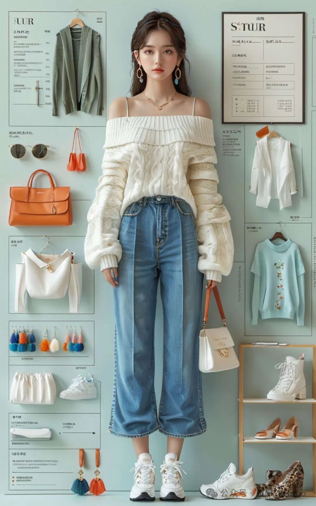 Prompt: XUER classification by clothing part,1girl,solo,white off-shoulder_sweater,Girl and her stuff,encyclopedia,infographic design,magazine design,visualization,reference sheet,jewelry,standing,earrings,shoes,bag,hoop earrings,fashion,highly detailed,ultra-high resolution,32K UHD,sharp focus,best-quality,masterpiece,classification by clothing part,<lora:绪儿 分类背景 XUER classification by clothing part:0.8>,
