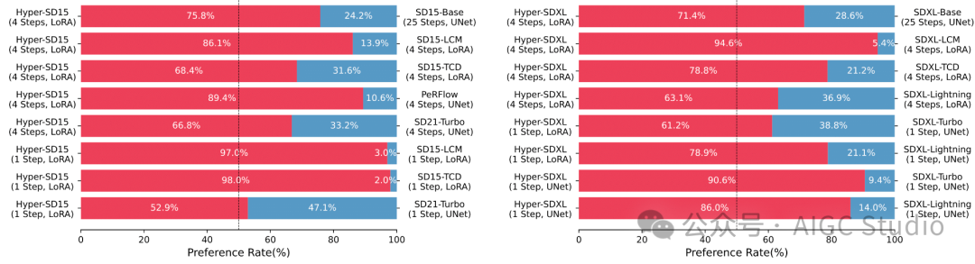 Hyper-SD 与现有的专注于加速的方法相比表现出了显著的优势,并在 SD1.5 和 SDXL 架构上获得了更多的用户偏好。