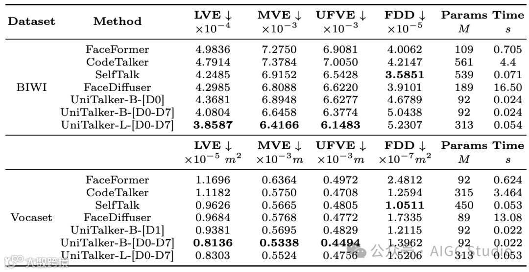 BIWI-Test-A 和 VOCA-Test 的定量结果。最佳值以粗体显示。