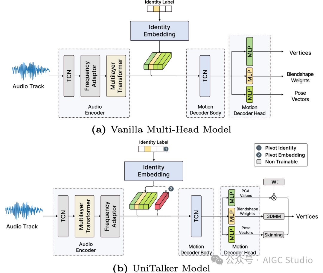 架构比较。(a)Vanilla 多头音频到人脸模型。