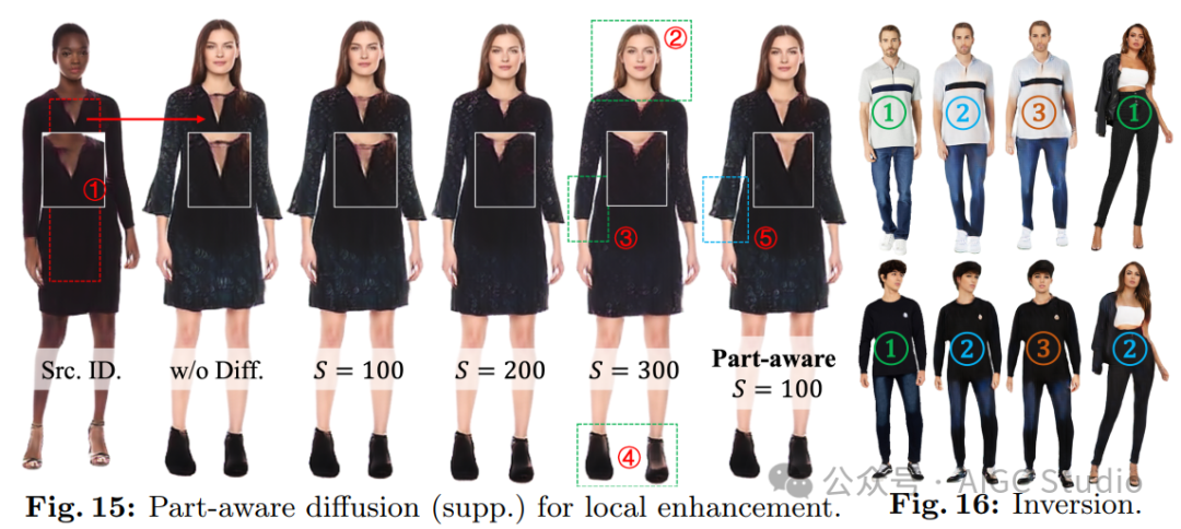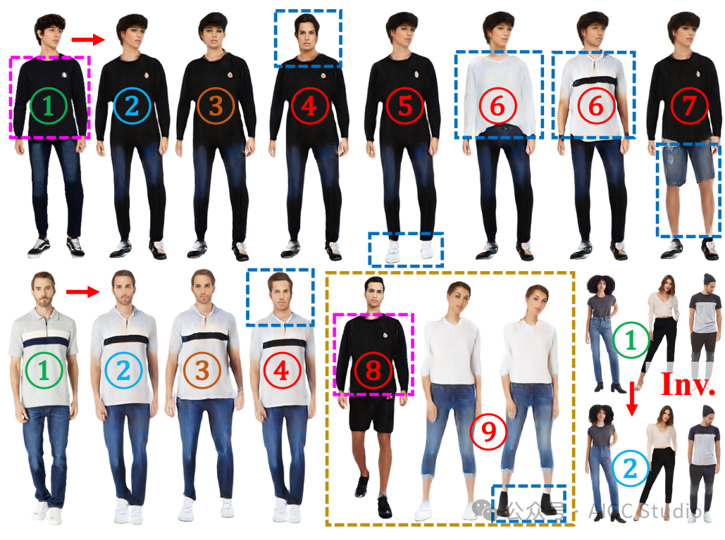 StructLDM 生成多样化的视图一致的人类,并支持不同级别的可控生成和编辑,例如通过混合从 a) 中选择的五个部分进行合成生成,以及部分感知编辑,例如身份交换、局部服装编辑、3D 虚拟试穿等。请注意,生成和编辑与服装无关,无需服装类型或面具。