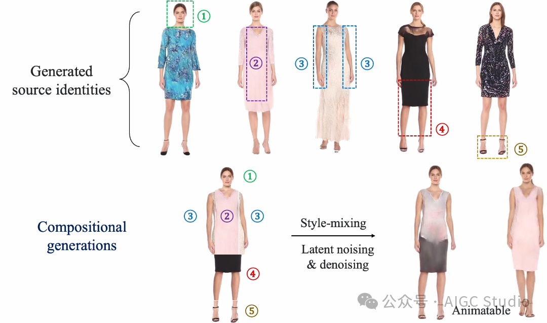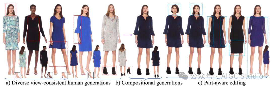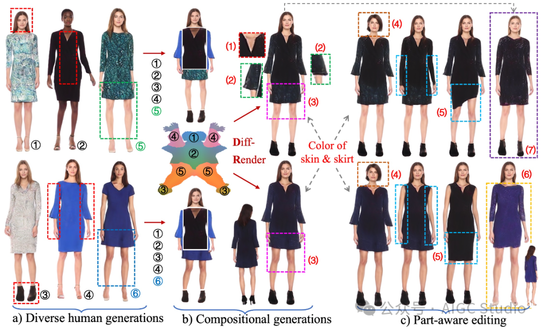 StructLDM 支持合成 3D 人体生成和部位感知编辑。从 a) 中选取六个身体部位,可以在 b) 中实现连贯的合成和混合结果。使用 Diff-Render 程序,部位感知编辑可以在 c) 中实现大量下游任务。