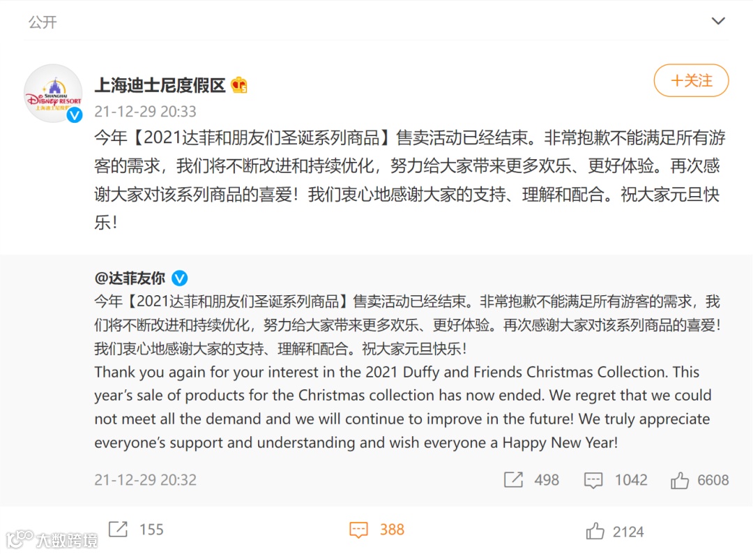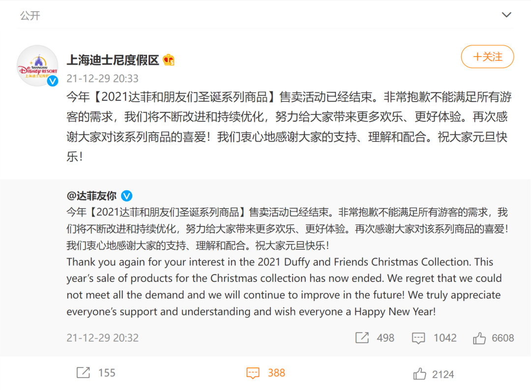 当天晚上,上海迪士尼官方微博发文称,今年【2021达菲和朋友们圣诞系列商品】售卖活动已经结束。非常抱歉不能满足所有游客的需求,我们将不断改进和持续优化,努力给大家带来更多欢乐、更好体验。再次感谢大家对该系列商品的喜爱!我们衷心地感谢大家的支持、理解和配合。祝大家元旦快乐!