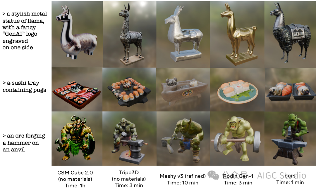我们推出了 3DGen,这是一个统一的管道,将 Meta 的文本到 3D 生成基础生成模型与纹理编辑和材料生成功能(AssetGen 和 TextureGen)集成在一起。通过结合它们的优势,3DGen 可以在不到一分钟的时间内从文本提示中实现非常高质量的 3D 对象合成。当由专业 3D 艺术家评估时,与行业替代方案相比,3DGen 的输出在大多数情况下更受青睐,尤其是对于复杂的提示,同时速度提高了 3 倍到 60 倍。 虽然我们目前对 AssetGen 和 TextureGen 的集成很简单,但它提出了一个非常有前途的研究方向,该方向建立在两个重点上: