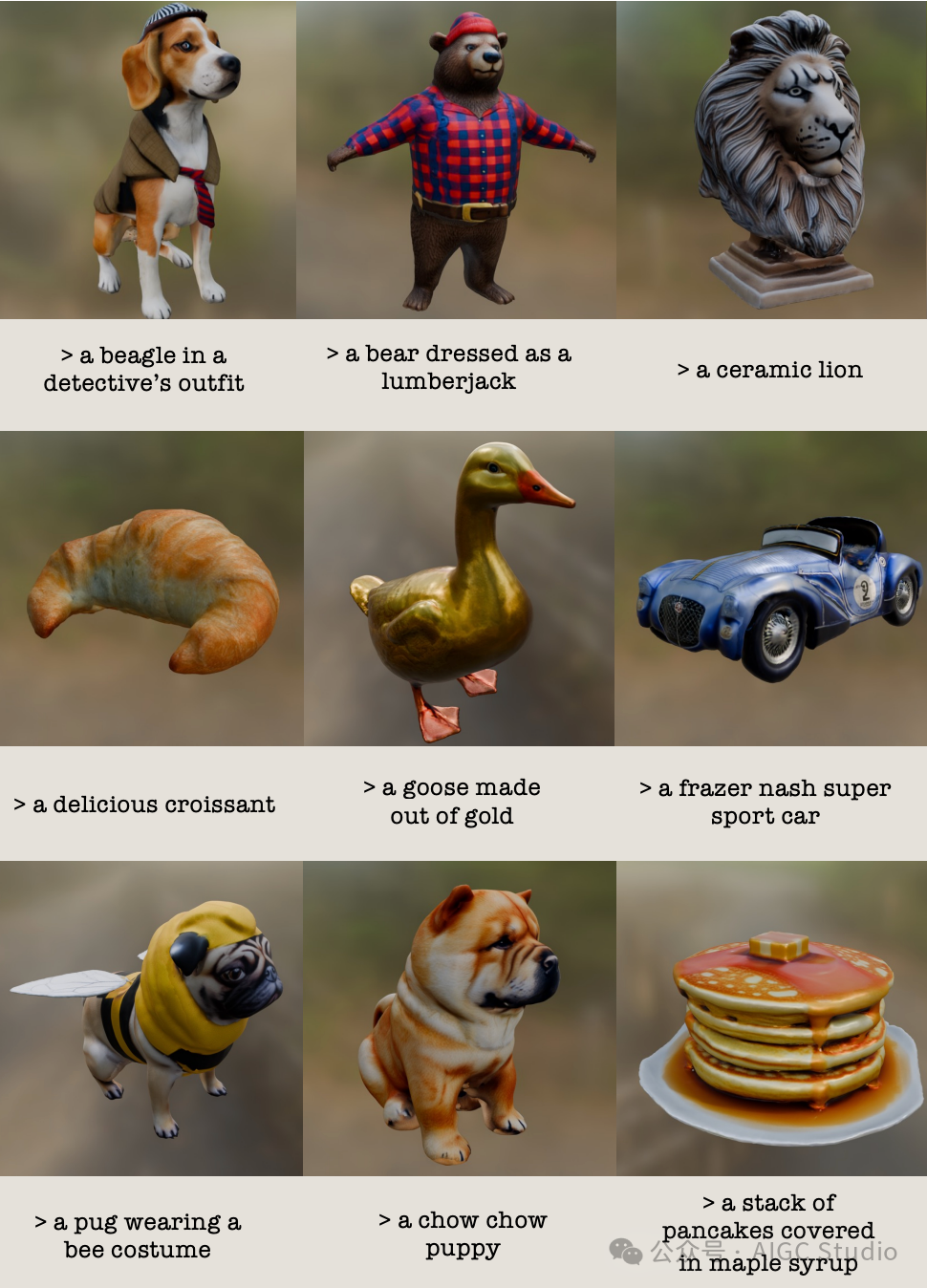 文本到3d生成的定性结果。我们展示了文本到3d生成的质量和多样性通过3DGen,跨越不同的场景类别(单个对象和组合)。