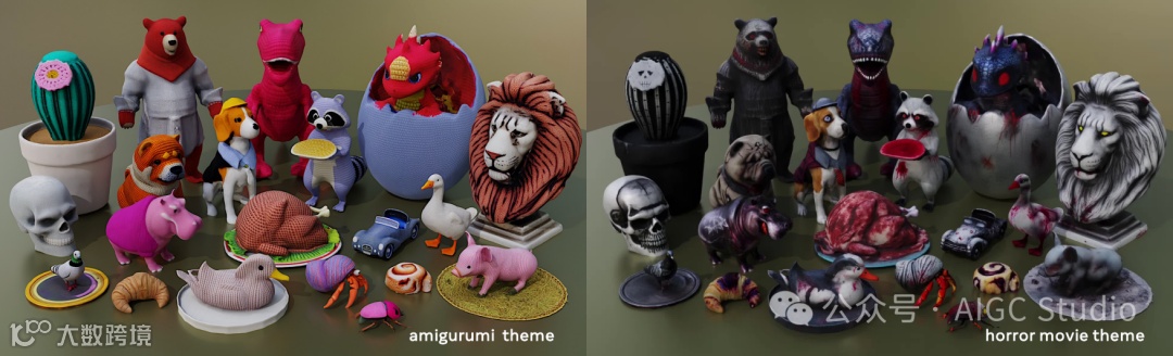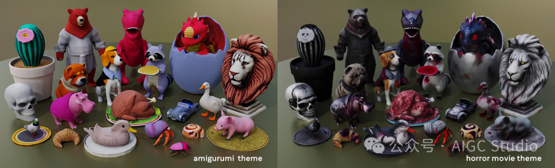 生成形状的纹理结果。Meta 3D Gen第二阶段制作的主题场景示例。通过以一致的方式用新的样式信息增加对象特定的纹理提示。