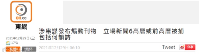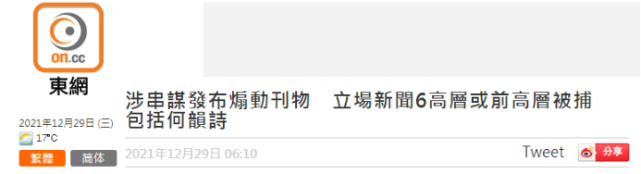 据了解,被拘捕6人为何韵诗、钟化权、周达智、吴霭仪、方敏生、林绍桐,当中5人为前董事,其余1人为署理总编辑,涉嫌提供平台发布煽动性文章,违反《刑事罪行条例》第9及10条串谋煽动意图罪。