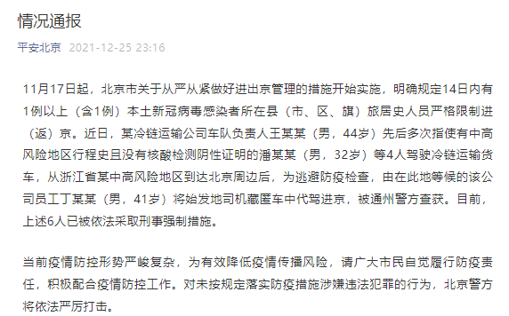 12月25日,针对冷链运输车队偷带有中高风险区行程史司机进京一事,北京通州警方发布情况通报,冷链运输公司车队负责人王某某等6人违反北京市防疫规定,已被依法采取刑事强制措施。