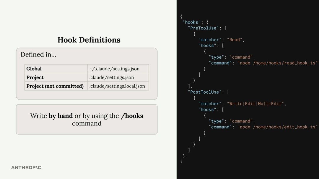 你可以在这些文件中手动编写钩子,或者在 Claude Code 内使用 /hooks命令。