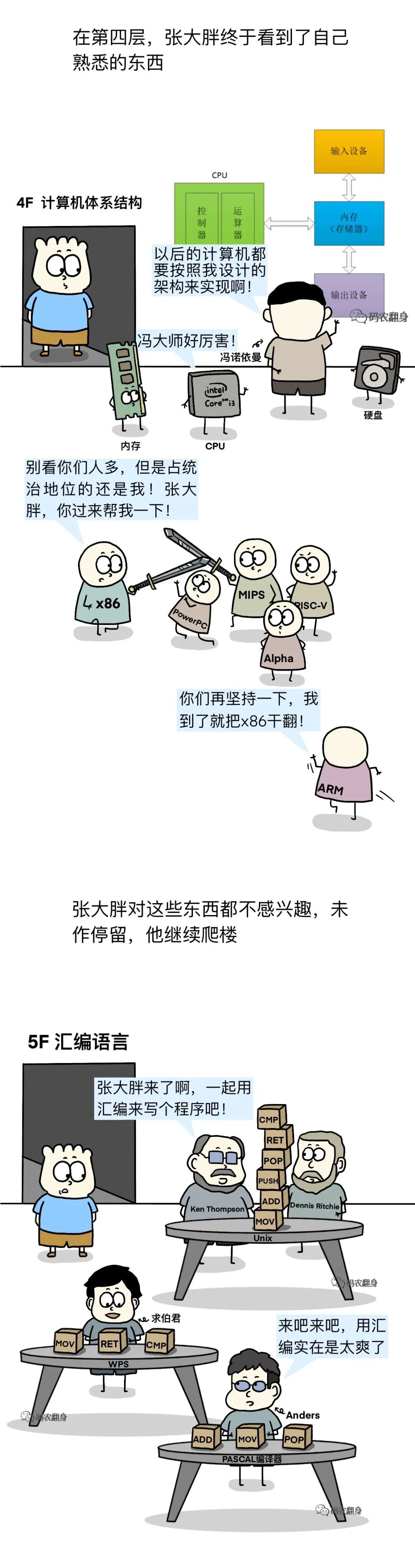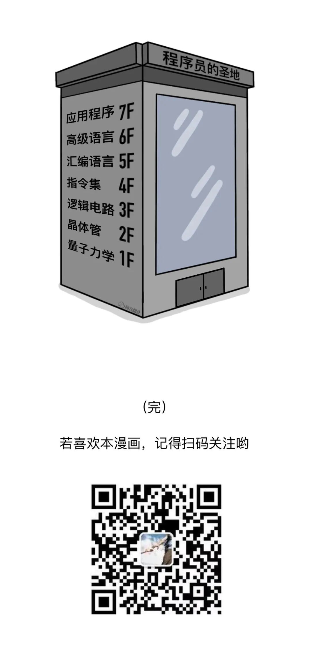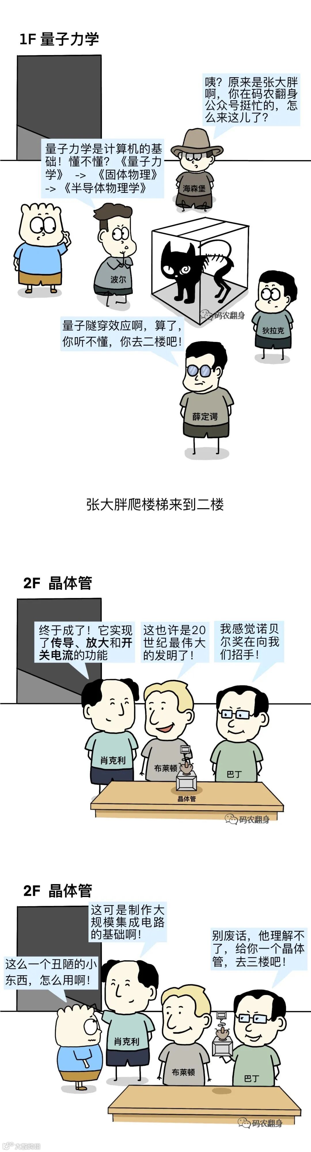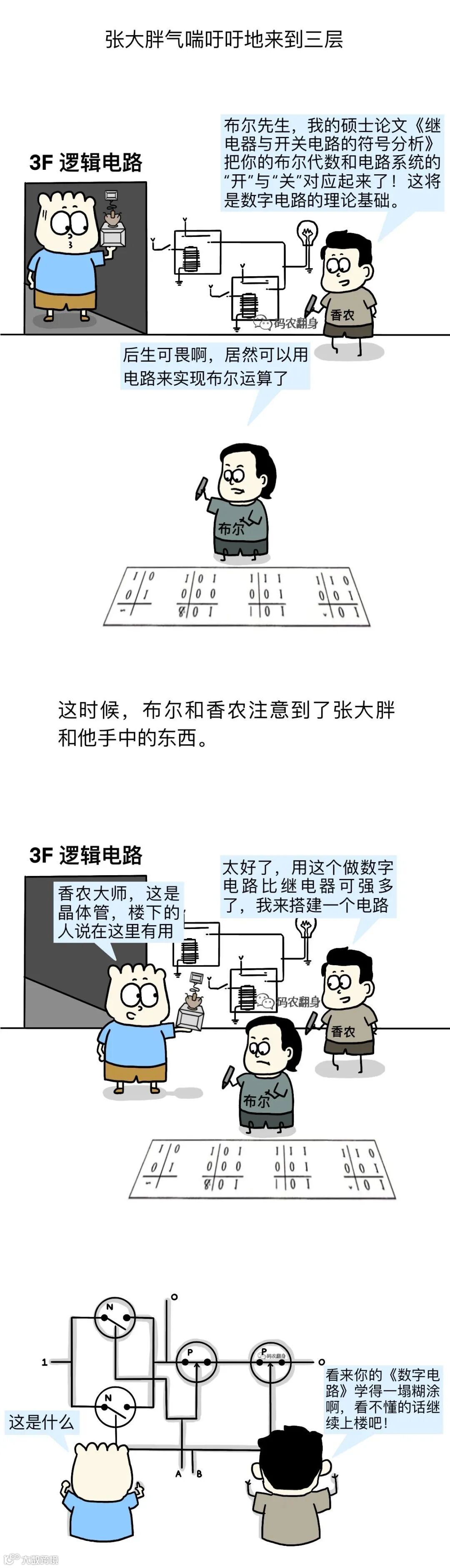 后记:计算机的摩天大楼是由很多大牛一手建造起来的,让人意想不到的是,这个大楼的基础居然是量子力学,从量子力学,到固体物理,再到半导体物理,物理学打下了坚实的基础。图灵(漫画中没有出现)提出了理论模型,布尔创立了布尔代数,香农的硕士论文(号称是本世纪最重要的硕士论文)证明这个布尔代数可以用继电器的开关电路实现, 为以后计算机的发展铺平了道路。随着晶体管的发明,计算机的电路才有可能小型化,微型化,形成超大规模的集成电路,放到电脑中,手机中。硬件完成以后,还需要软件的支持,对程序语言的需求就凸显出来,最早是用汇编,后来慢慢出现了C, C++这样的高级语言,非常适合系统级编程。还有Java, Python,JavaScript等这些运行在虚拟机中,实现业务逻辑非常高效的语言。