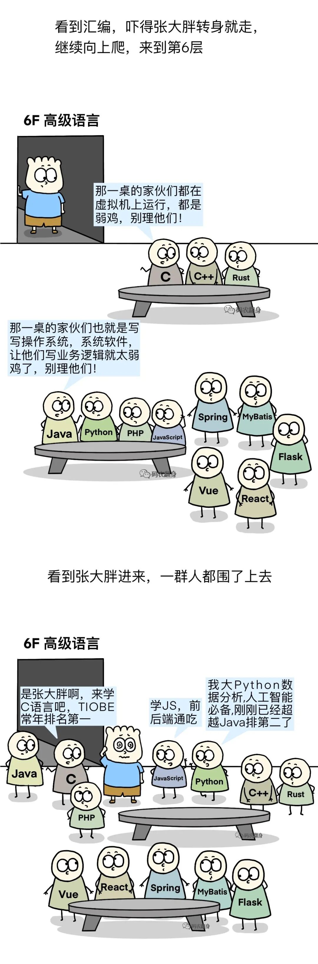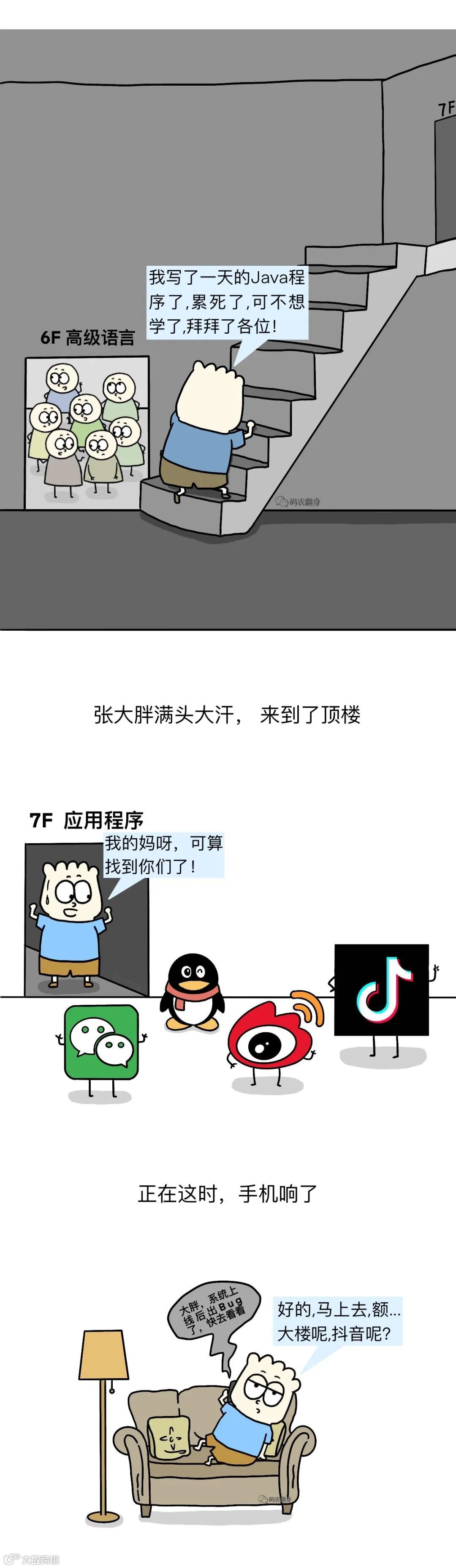 特别提醒:这篇漫画中的抽象层并不十分完善,例如没有机器语言......