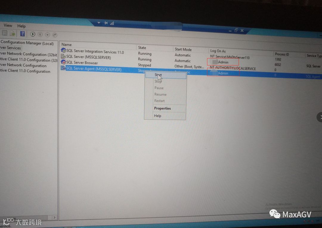 打开SSCM软件,使用上面的账户和密码登陆SQLServer(MSSQLSERVER)和SQL server Agent(MSSQLSERVER),并启动服务。