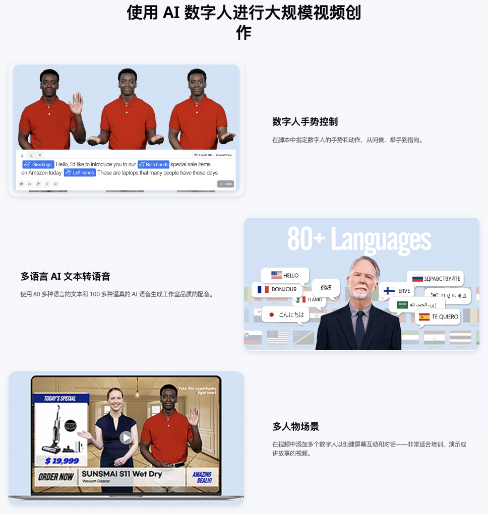 3. 多语言支持:AI STUDIOS支持多种语言的文本输入和视频生成,适应全球市场需求,帮助企业轻松实现跨语言宣传。