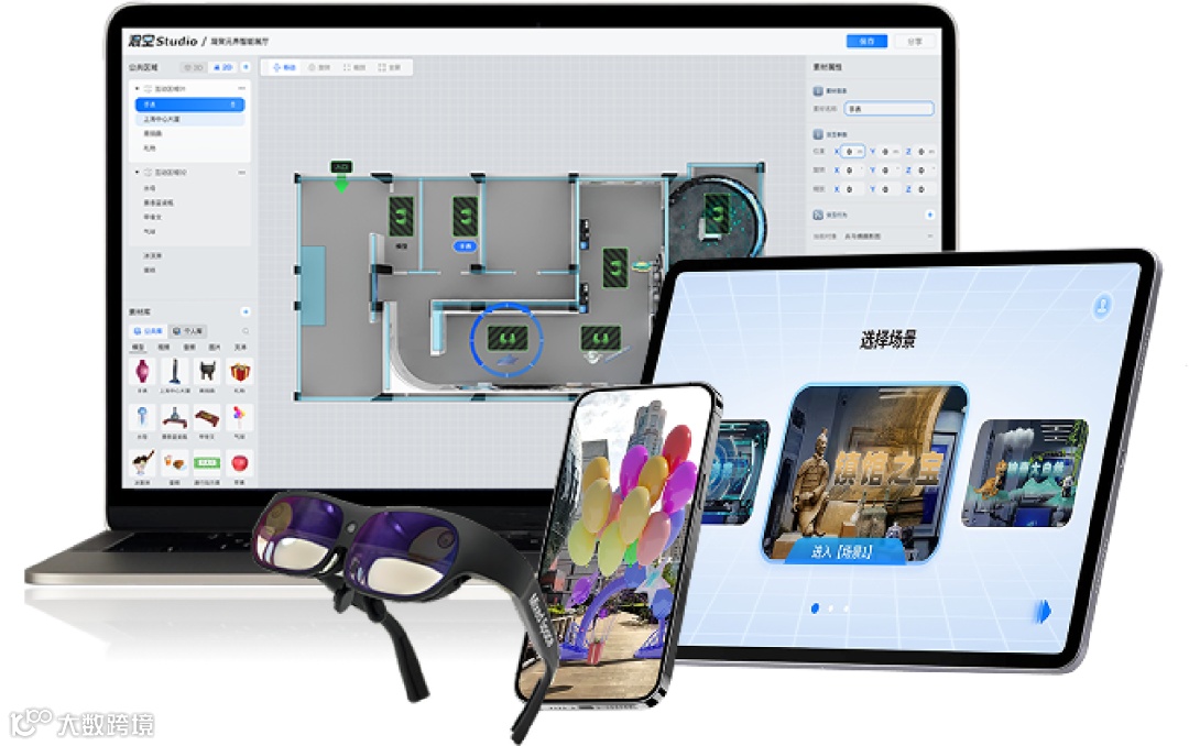 混空Studio由公司自主研发,应用于室内外空间定位及元宇宙场景搭建,是一款帮助用户快速搭建元宇宙科技展示的平台,主要实现虚实融合、不同空间交融的沉浸式三维互动体验。采用点云算法、空间定位识别算法、图形图像识别算法等技术,通过 AR/MR/VR-XR 眼镜及移动设备呈现出三维互动空间。